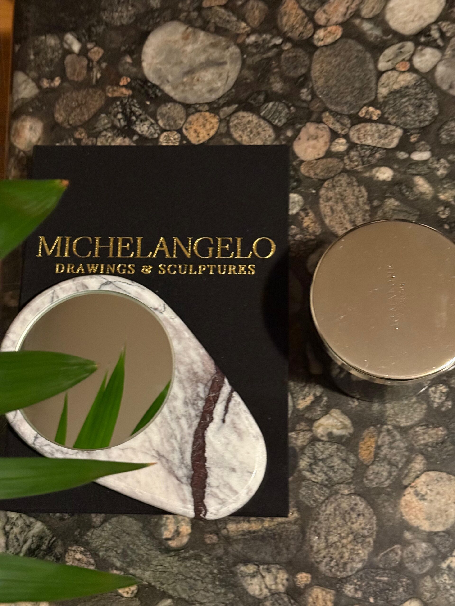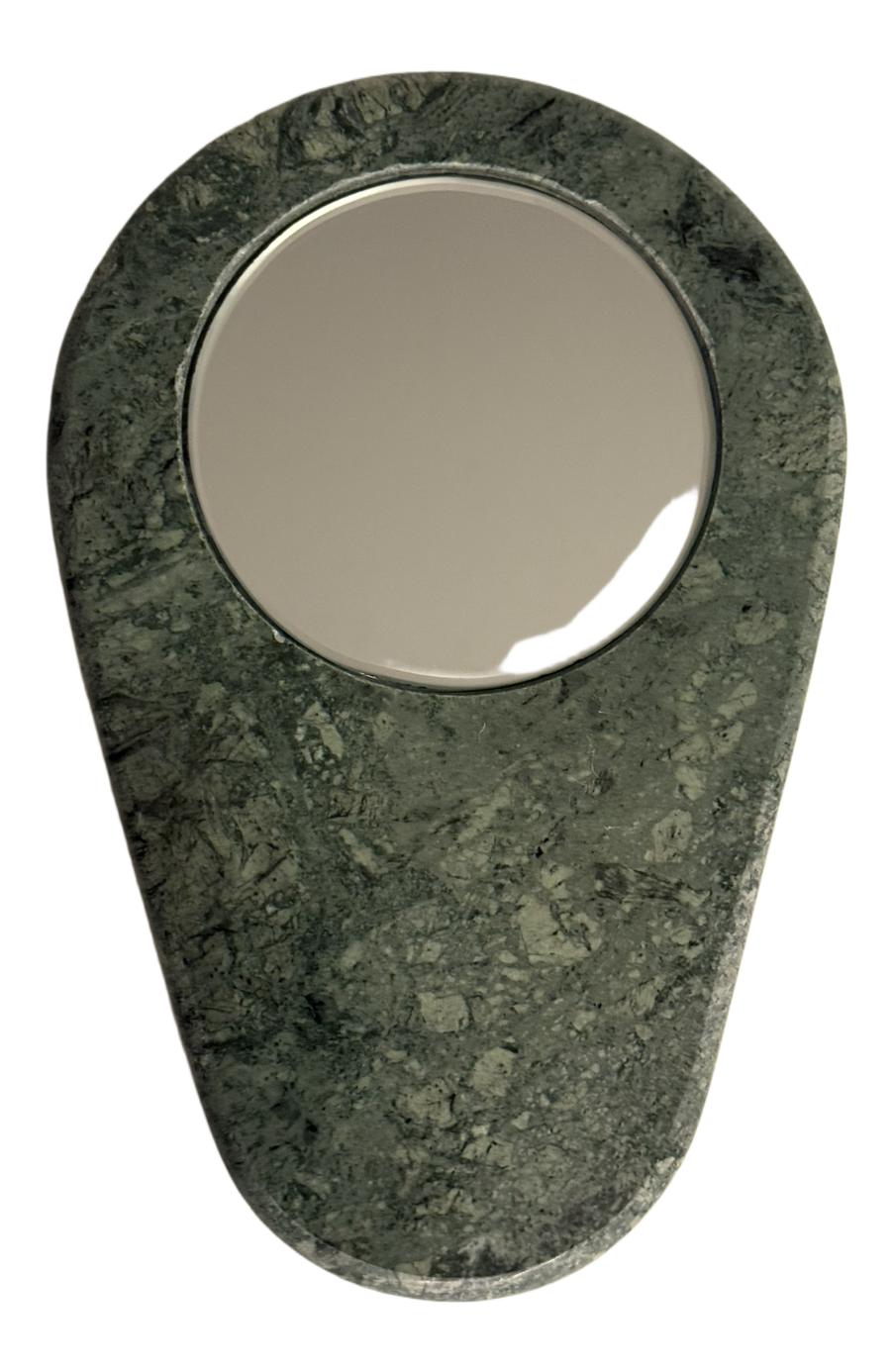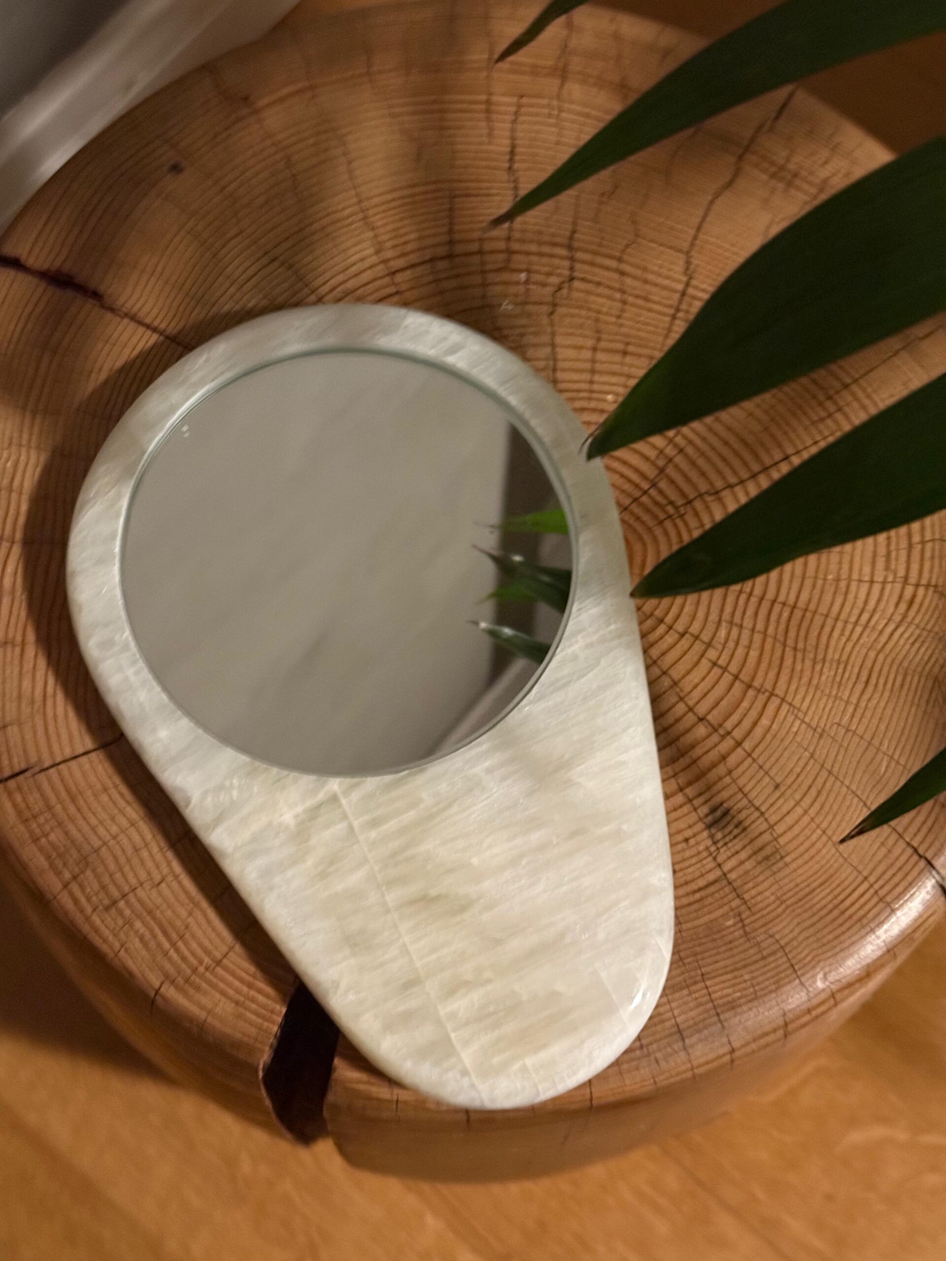 These organically shaped mirrors bring the elegance of nature into interior spaces. Each piece is crafted from a different type of natural stone — such as green onyx or light-toned onyx — making every mirror unique with its own veining and coloration. The soft, rounded form serves as both a decorative object and a functional mirror. Perfectly suited for tabletops, consoles, or styled over books, this collection offers a refined blend of modern design and natural aesthetics.