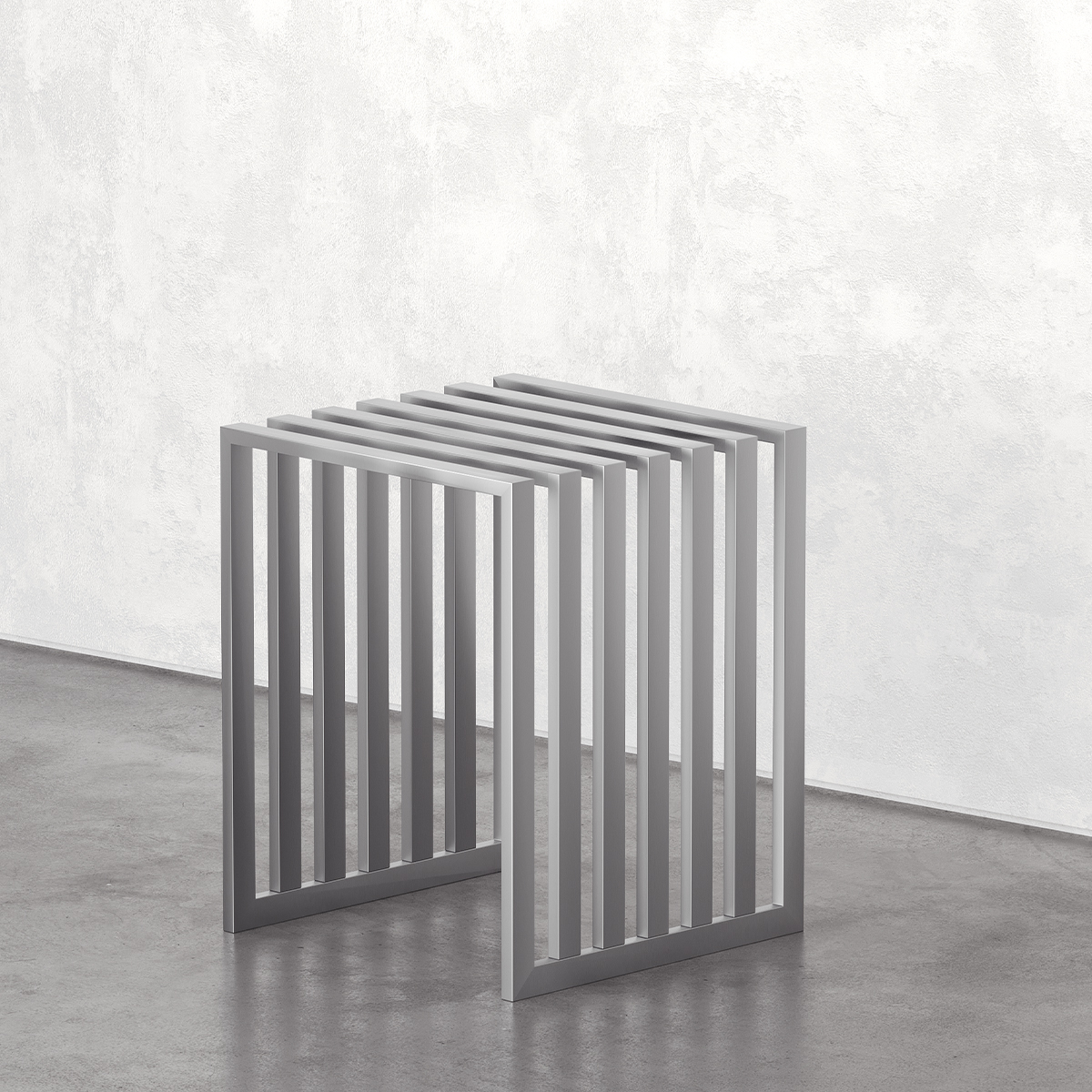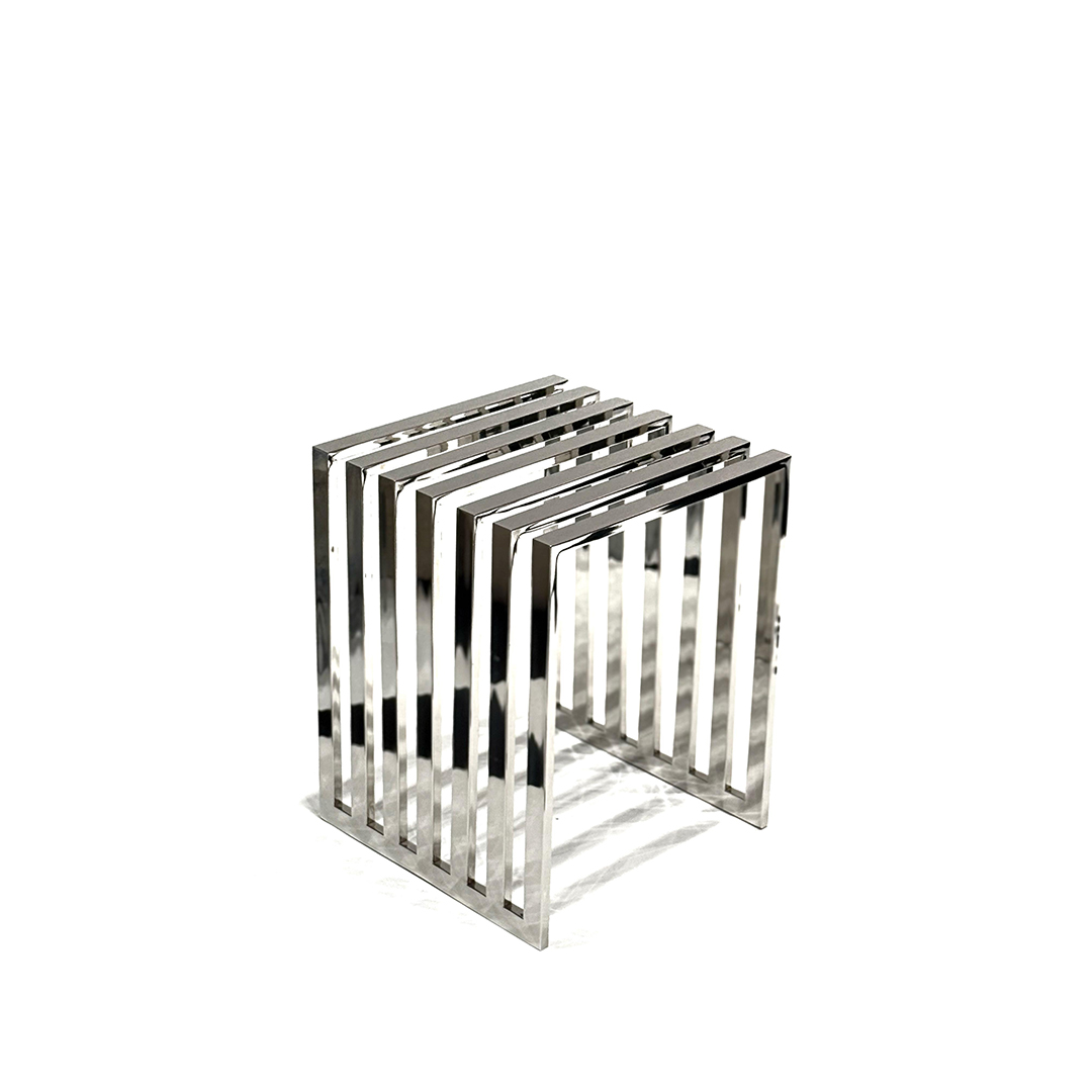 This product is a modern and minimalist side table crafted from aluminum sheet metal. Its polished, reflective surface enhances its sleek and contemporary appeal. The design features parallel vertical slats, creating a visually dynamic structure that balances openness and stability. Its geometric form allows for versatile use, making it an elegant addition to modern interiors. Perfect as a side table or display stand, this piece combines functionality with an artistic aesthetic.